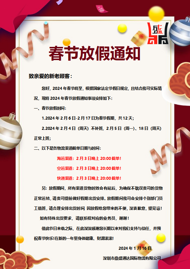 关于春节放假通知及各物流渠道截单日期与时间