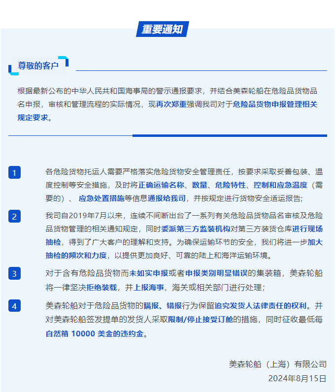 美森轮船再次强调危险品货物申报管理相关规定要求!