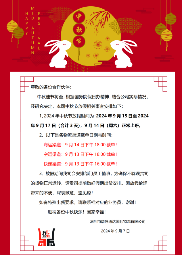 鼎盛通达国际物流中秋放假时间&截单时间通知