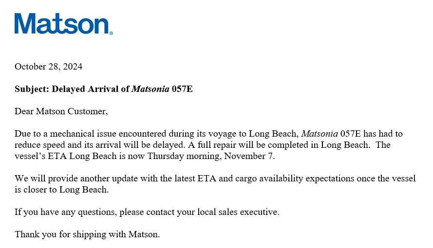 该船预计于11月7日(周四)上午抵达长滩港。