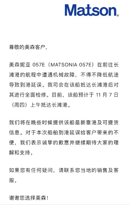程中遭遇机械故障,不得不降低航速导致到港延误。
