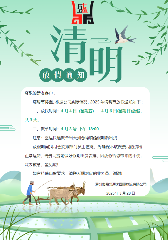 鼎盛通达国际物流清明节放假时间&截单时间通知