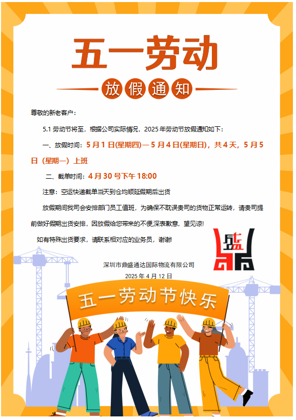 鼎盛通达国际物流51劳动节放假时间&截单时间