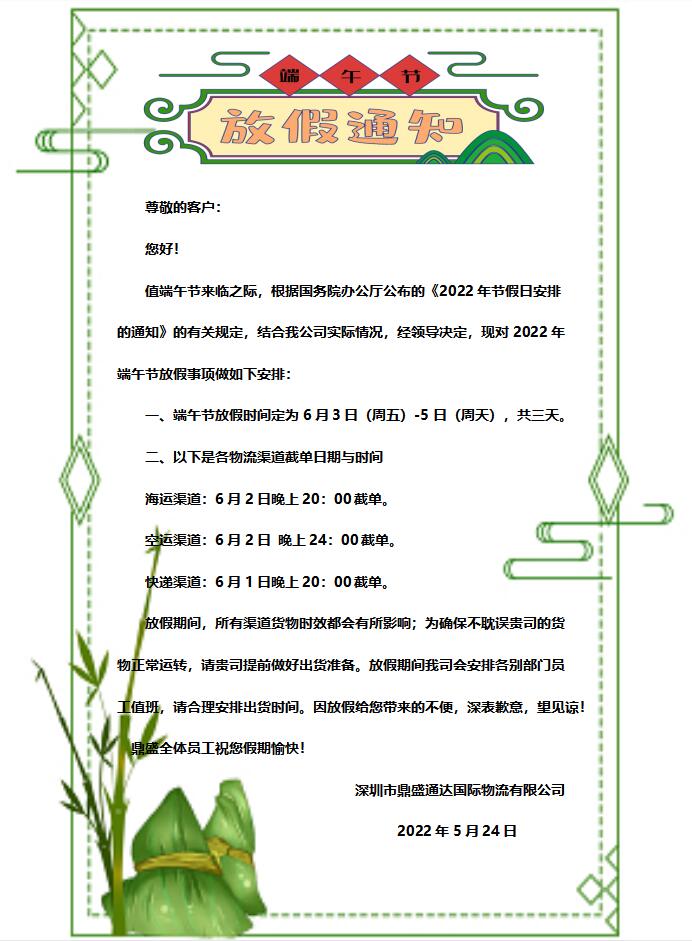 鼎盛国际物流2022年端午假放假及渠道截单时间通知